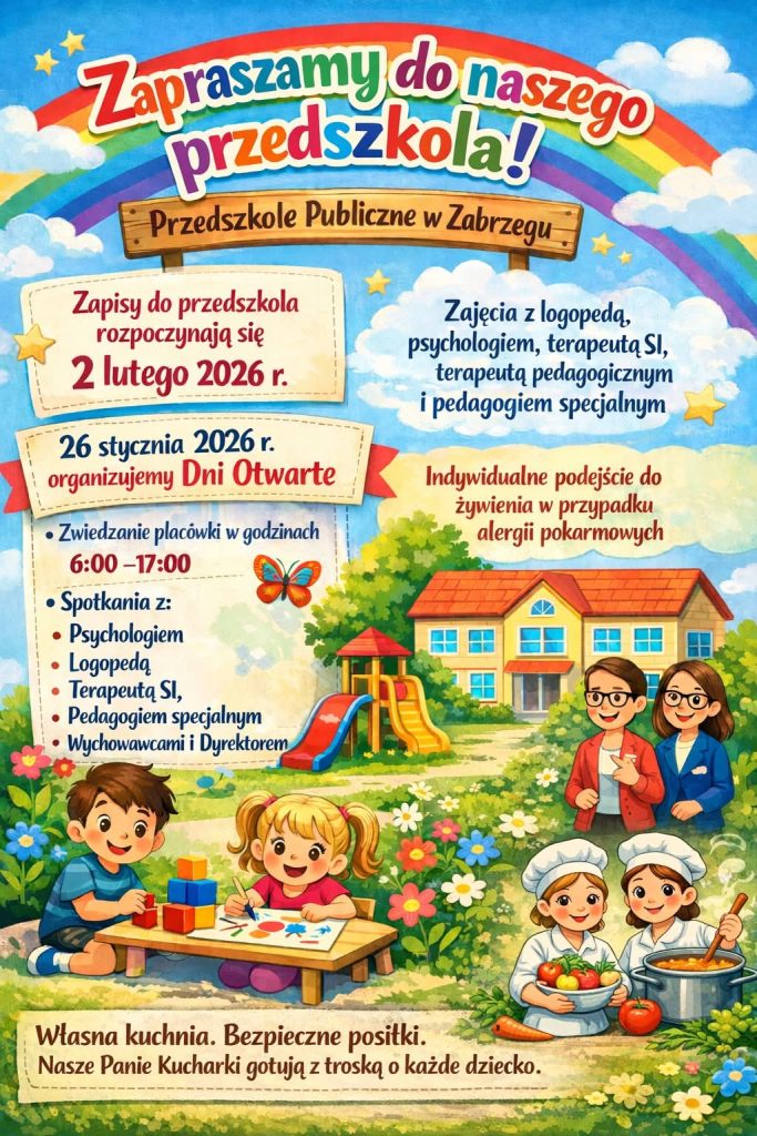 📅 Dni Otwarte – 26 stycznia 2026 r.Zapraszamy do zwiedzania naszej placówki w godzinach 6:00–17:00 oraz do rozmów z naszym zespołem specjalistów:👩⚕️ psychologiem🗣 logopedą🧩 terapeutą SI📘 pedagogiem specjalnym👩🏫 wychowawcami oraz dyrektorem przedszkola